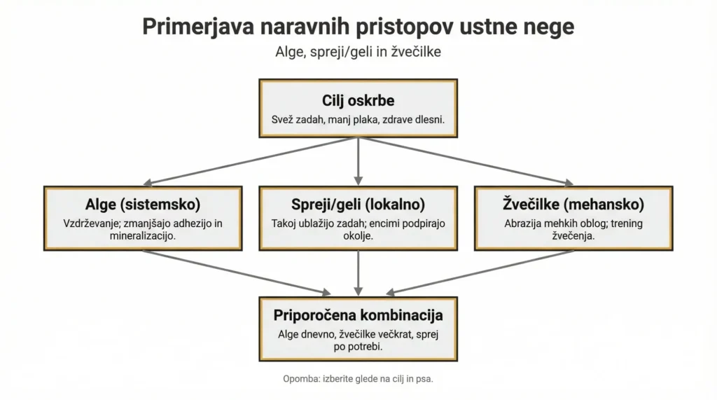 Samo slab zadah: topični sprej/gel za takojšen učinek; alge za vzdrževanje. Plak/kamen: algni prašek kot baza + žvečilke za mehanski učinek. Občutljive dlesni: encimski gel brez dražilcev, nato postopno dodajanje alg. Po profesionalnem čiščenju: kombinacija vseh treh, a z nižjimi odmerki za vzdrževanje. Pri psih, ki ne marajo ščetkanja, naj mehanski del prevzamejo prilagojene žvečilke.