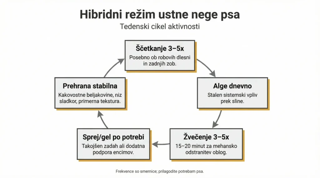 Ščetkanje ostaja zlati standard za obzobne robove. Hibridni režim: ščetkanje 3–5x tedensko, alge dnevno, žvečenje 3–5x tedensko, sprej/gel po potrebi. Takšen miks prinaša večji učinek kot katerikoli element samostojno. Če pes ščetkanje odklanja, začnite z gelom na blazinici prsta in napredujte do mehke ščetke.