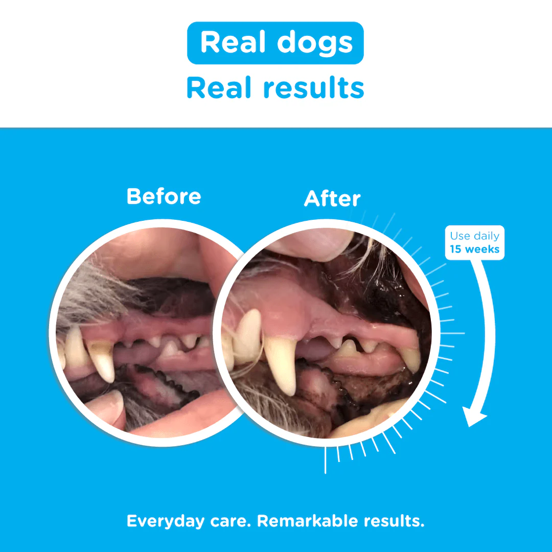 Za najboljše rezultate: Dodajte tudi mehansko čiščenje zob (grizenje, žvečenje), da odstranite zmehčan zobni kamen. Ko dosežete želene rezultate, zmanjšajte odmerek na polovico za ohranjanje.