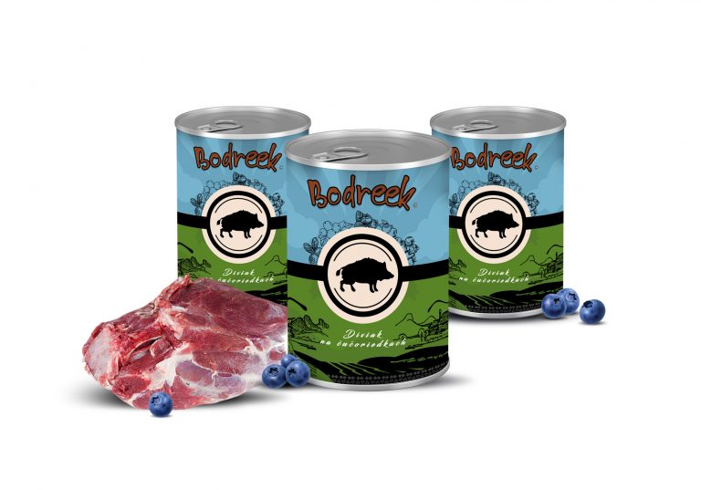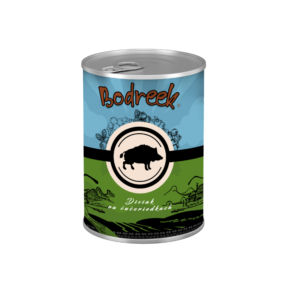 Bodreek Divji prašič z borovnico je naravna mokra hrana za pse z zelo visokim deležem kakovostnega mesa divjega prašiča. Receptura združuje izbrano meso in sadje ter tako ustvarja hranljiv in zelo okusen obrok za pse vseh pasem.