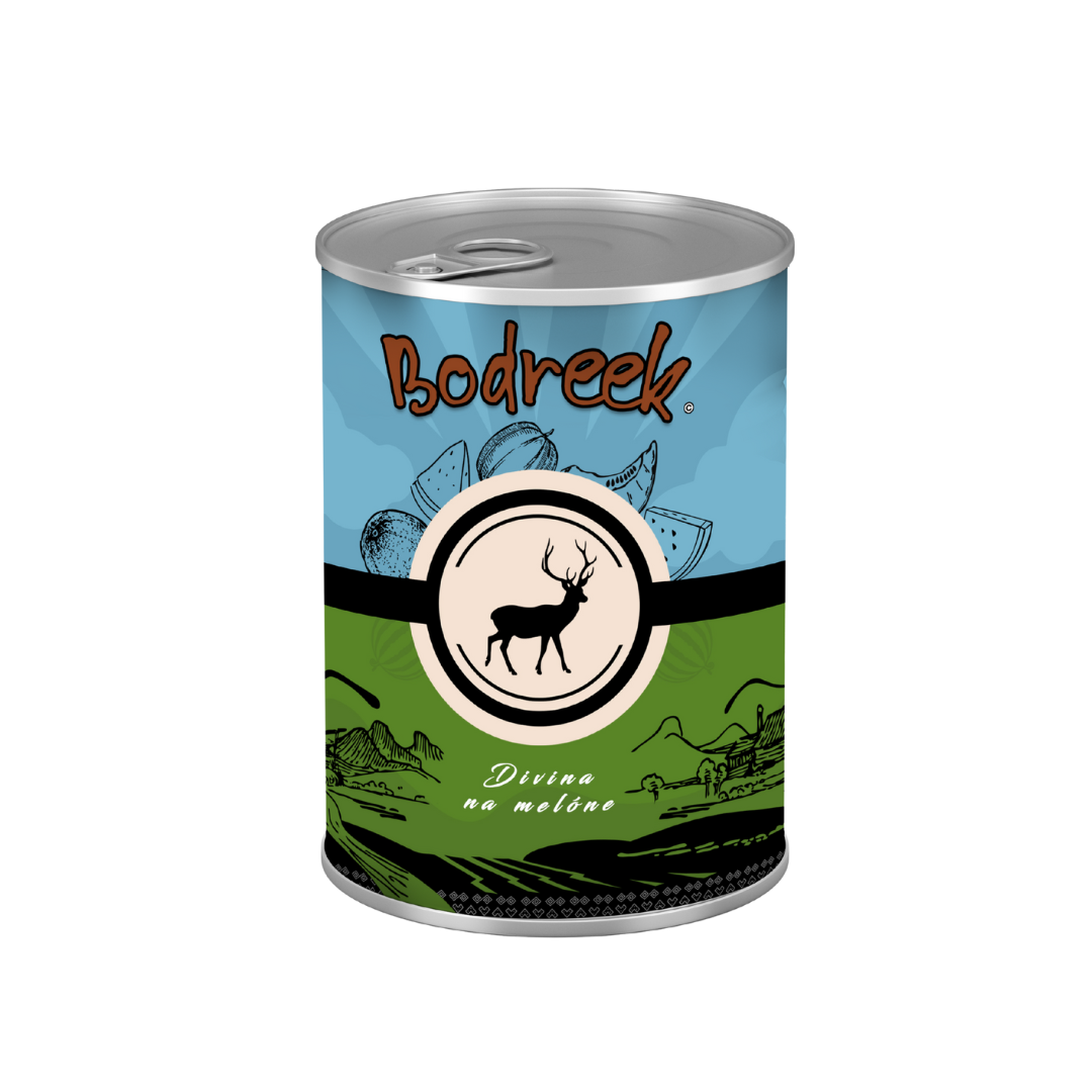 Bodreek Jelenjad z melono je naravna popolna mokra hrana za pse z zelo visokim deležem kakovostnega mesa jelena. Receptura združuje izbrane sestavine in sadje ter tako zagotavlja hranljiv in okusen obrok za pse vseh pasem.