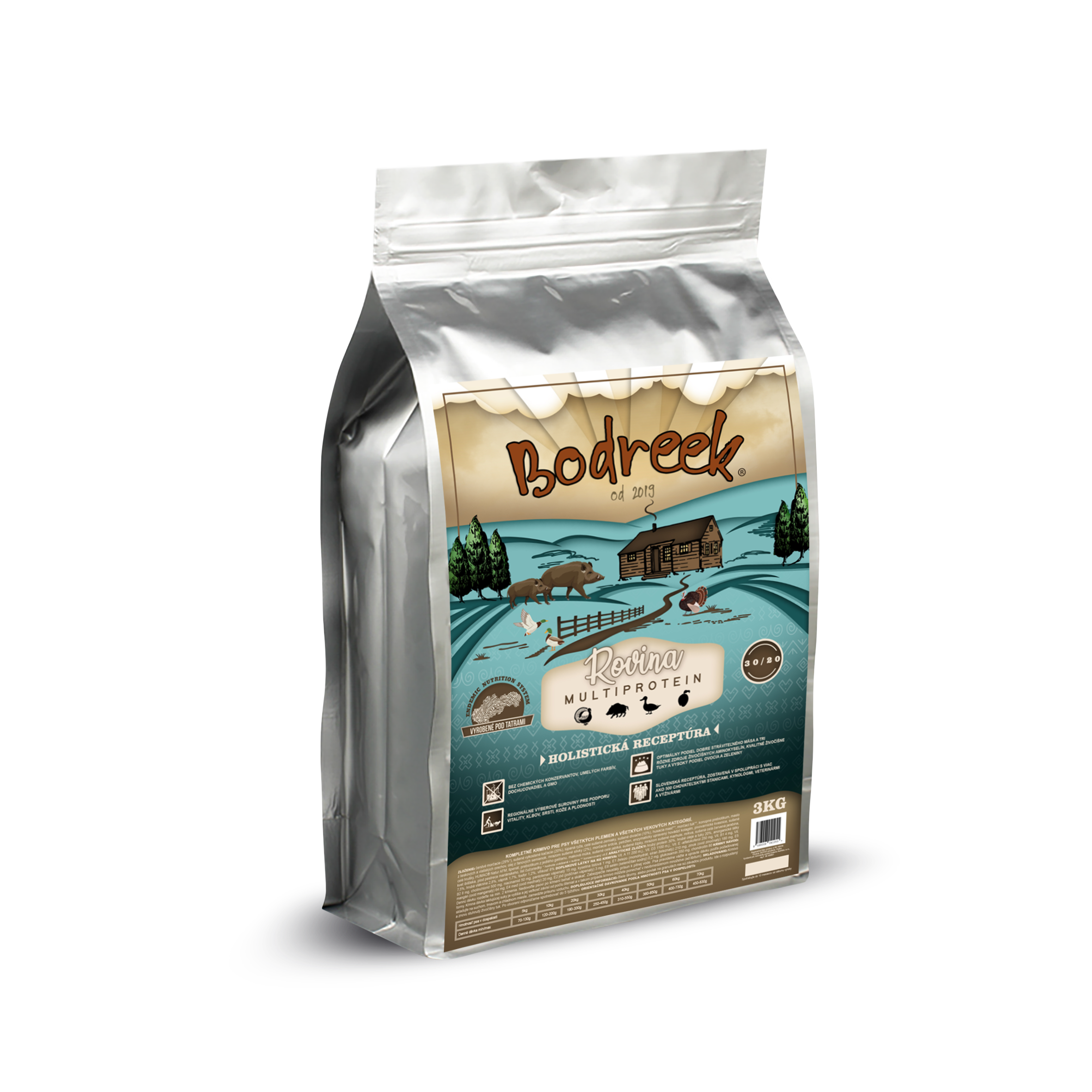 100-odstotno naravno holistično hrano Bodreek Rovina Holistic izdelujejo v majhnem družinskem podjetju na Slovaškem iz surovin šlovaških dobaviteljev. Na podlagi znanja, zbranega od domačih rejcev in kinologov, združenega v recepture Endemic Nutrition System, so ustvarili popolno in uravnoteženo formulo iz treh različnih virov mesa ter kontinentalnega sadja in zelenjave.
