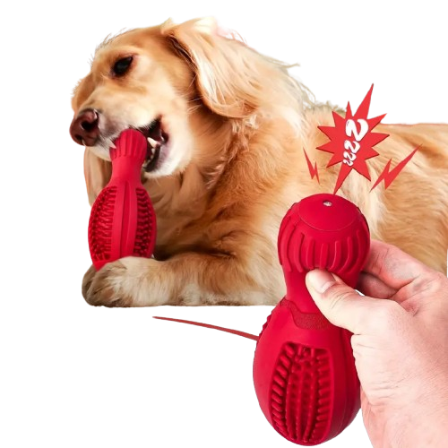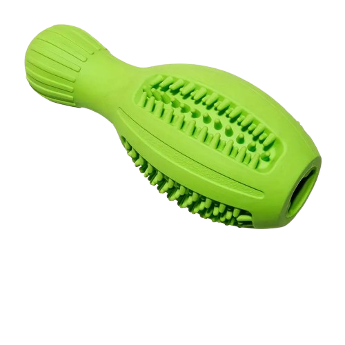 Trpežna in varna žvečilna igrača iz naravne gume združuje zabavo, miselno stimulacijo in podporo ustni higieni. Oblika z zobci omogoča vnos priboljškov, arašidovega masla ali pasje zobne paste, kar psa spodbuja k dolgotrajnemu grizenju in čiščenju zob.